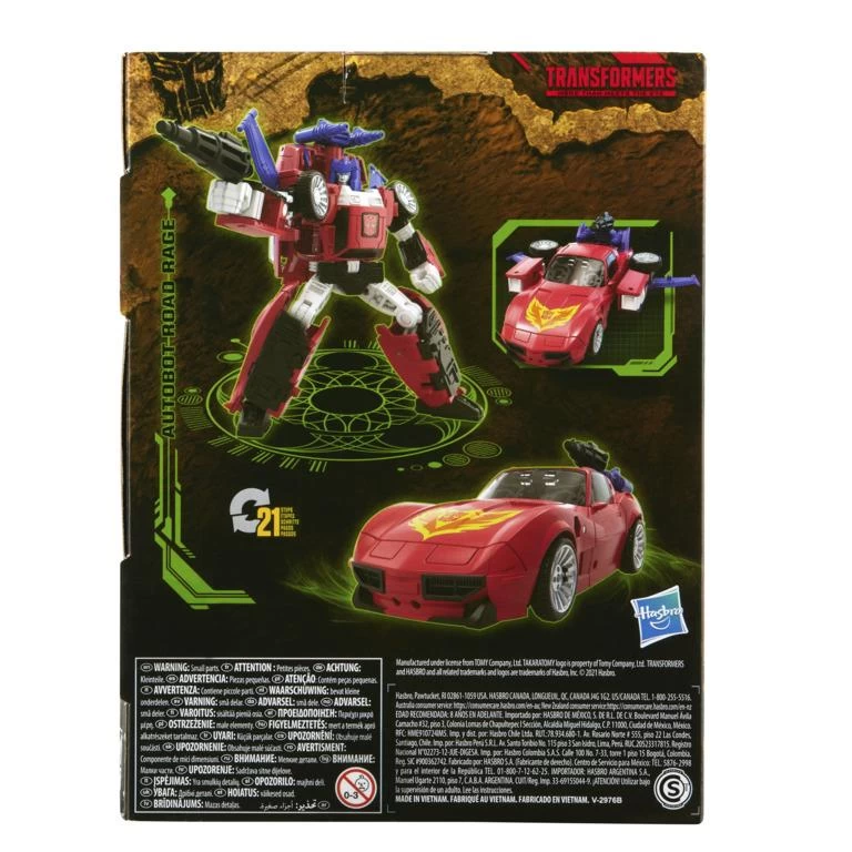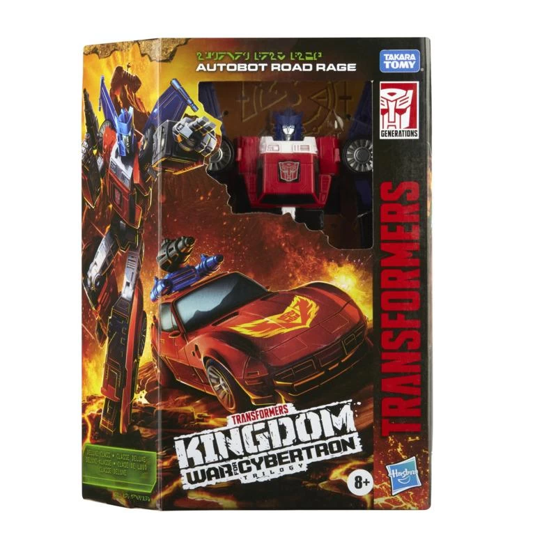 Includes Transformers Generations War for Cybertron: Kingdom Deluxe Class Autobot Road Rage figure, 2 accessories, and instructions.