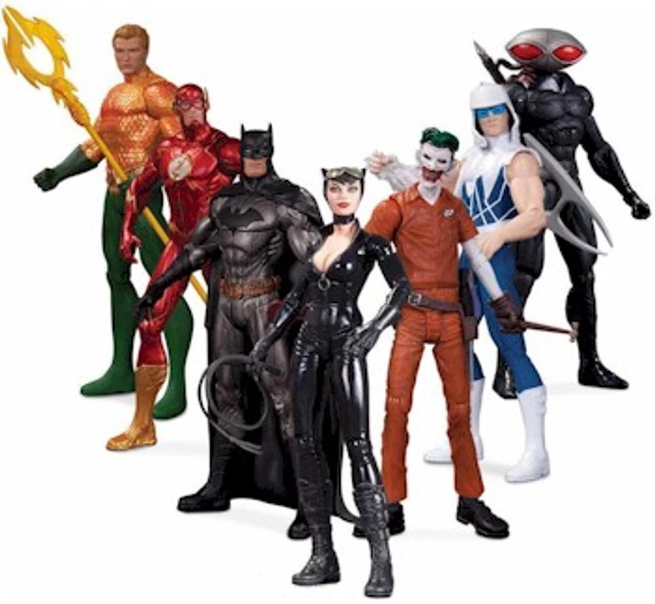 The battle between good and evil rages on with this special 7-pack action figure set that includes Aquaman, The Flash, Batman, Catwoman, The Joker, Captain Cold, and Black Manta!