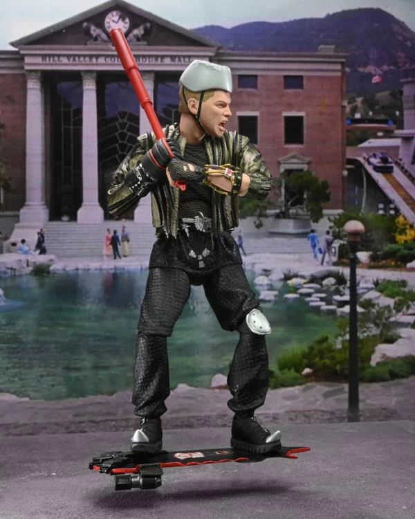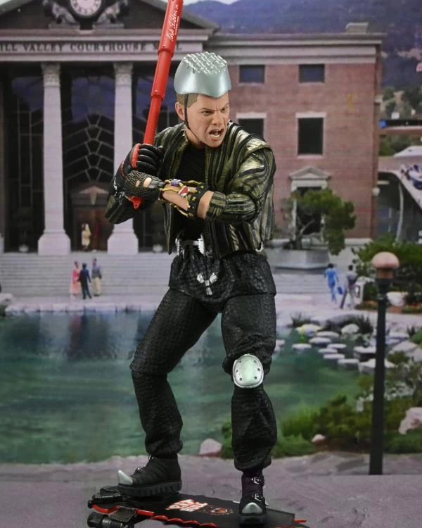 In Back to the Future Part 2, Marty and Doc experience the adventure of a lifetime in an unlikely time machine as they travel to the past, present, and future, setting off a time- shattering chain reaction that disrupts the space- time continuum! Standing approximately 7” tall, this Ultimate Griff Tannen figure is a menace! Includes telescoping bat, interchangeable head, hoverboard, and flight stand accessories. Display- friendly window box packaging with opening front flap